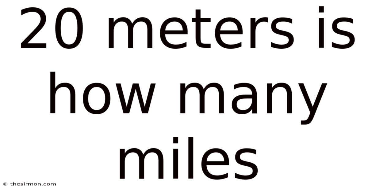 Which means, 20 meters is approximately 0.0124 miles. Put another way, twenty meters covers just over one‑hundredth of a mile.