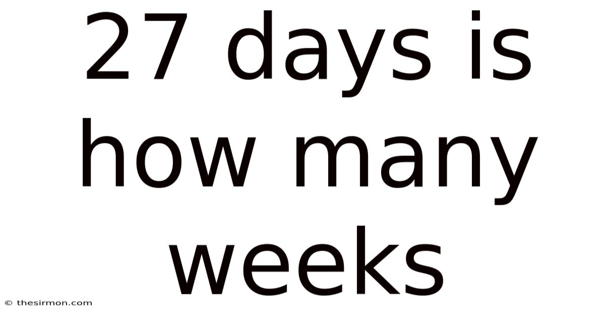 To find out how many weeks are in 27 days, we need to perform a simple calculation. Consider this: by dividing the total number of days by the number of days in a week, we can determine the equivalent number of weeks. This result indicates that 27 days is roughly 3 weeks and 6 days. 857 weeks**. Take this: if we take 27 days and divide it by 7, we get approximately **3.Here's the thing — this process is straightforward but important for clarity. Understanding this breakdown helps us visualize how time accumulates and how we can plan accordingly.