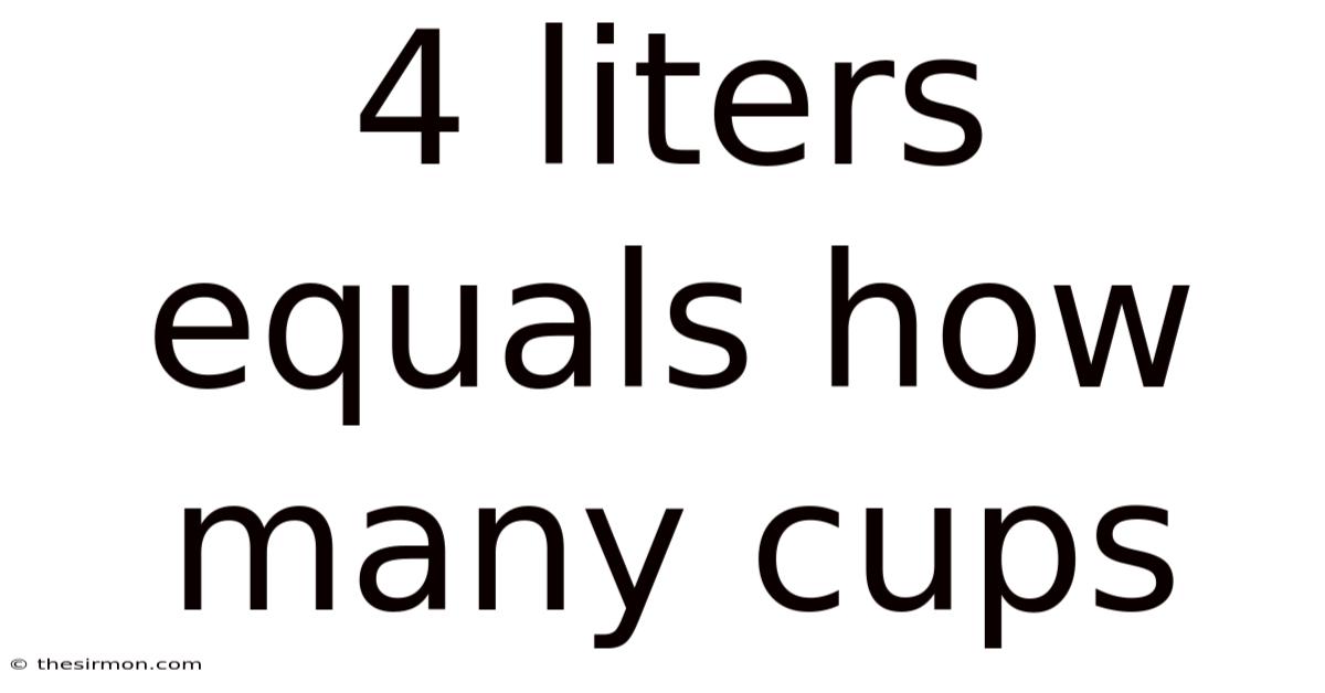 - Practical Takeaway: 4 liters is approximately 16 and 2/3 US cups. For everyday cooking, you can round this to 16.7 cups or 16 cups + 2/3 cup.