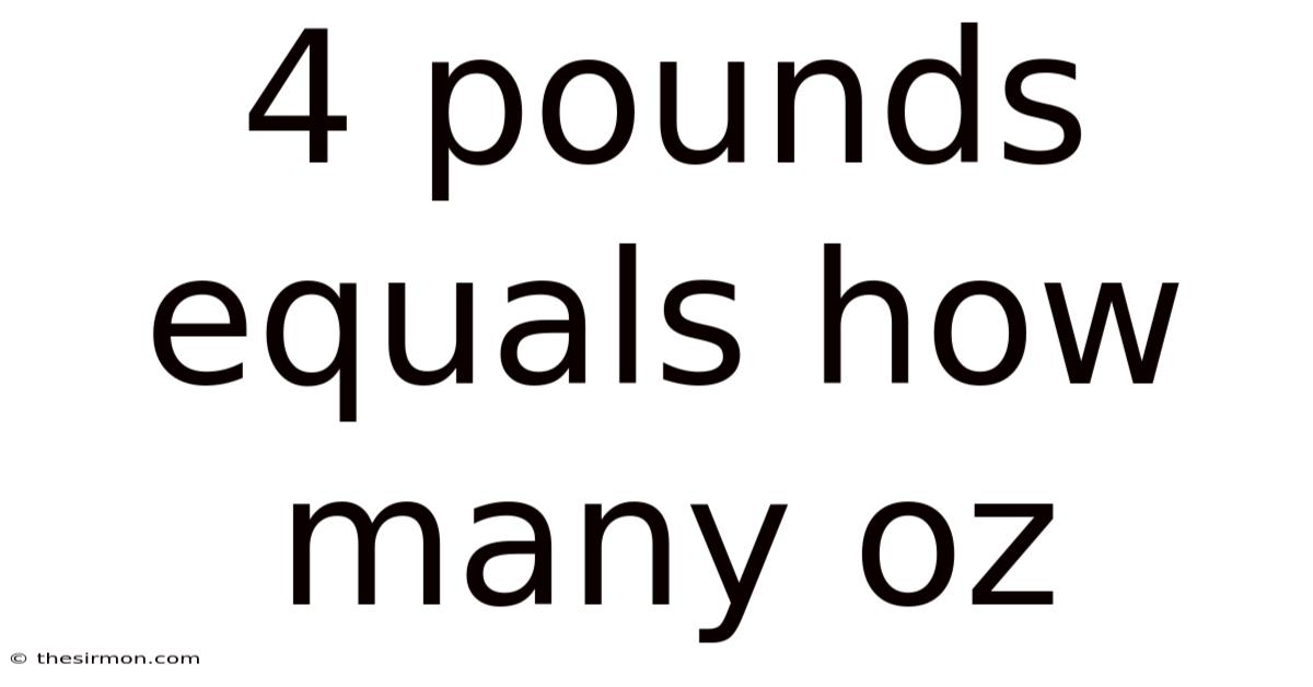 Which means, 4 pounds equals 64 ounces. In practice, this conversion is consistent and can be applied to any number of pounds. Still, if you have 2 pounds, it would be 32 ounces (2 x 16). If you have 5 pounds, it would be 80 ounces (5 x 16), and so on.