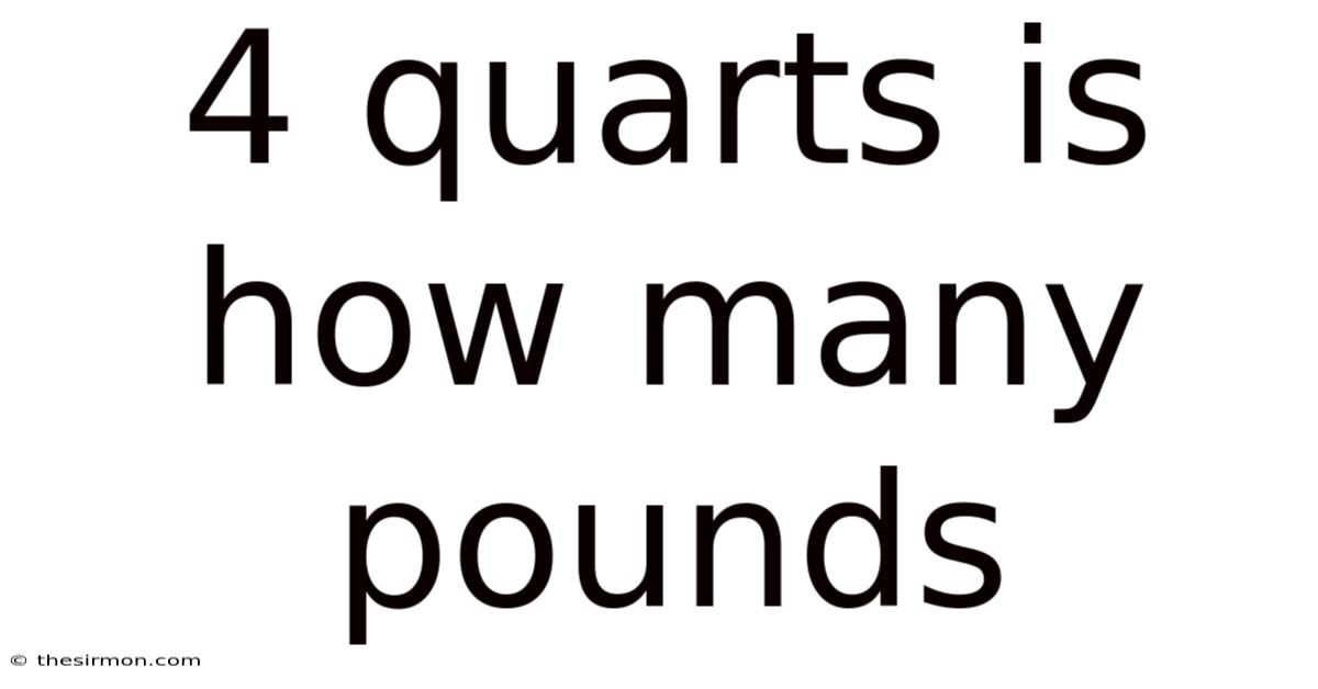 When dealing with recipes, science experiments, or shipping calculations, you've likely wondered "4 quarts is how many pounds?Day to day, " This question highlights the fundamental challenge of converting between volume and weight measurements. While quarts measure the space something occupies (volume), pounds measure the force of gravity on an object (weight). Still, the conversion isn't straightforward because it depends on the density of the substance being measured. In this thorough look, we'll explore the relationship between quarts and pounds, provide specific conversions for common substances, and equip you with the knowledge to make accurate conversions in various contexts But it adds up..