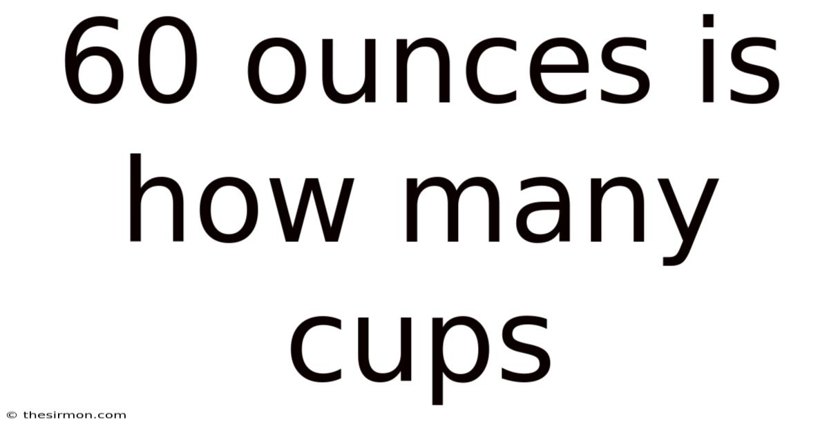 So, 60 ounces equals 7.5 cups. Basically, 60 ounces is the same as 7 full cups plus half a cup. In cooking terms, half a cup is equivalent to 4 ounces And that's really what it comes down to..