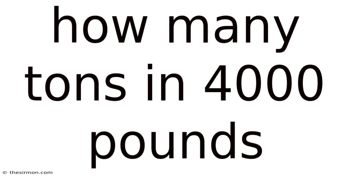 When someone in the United States asks how many tons in 4000 pounds, they usually mean the short ton. Even so, this makes the answer 2 tons. Think about it: if the question refers to metric tons, the result is about 1. 81 metric tons.